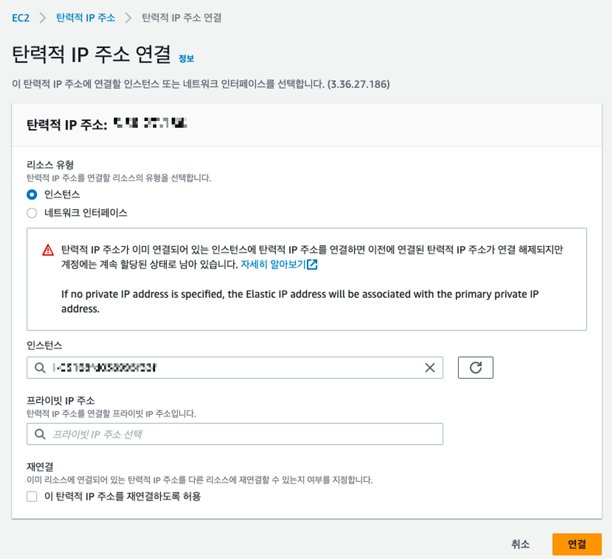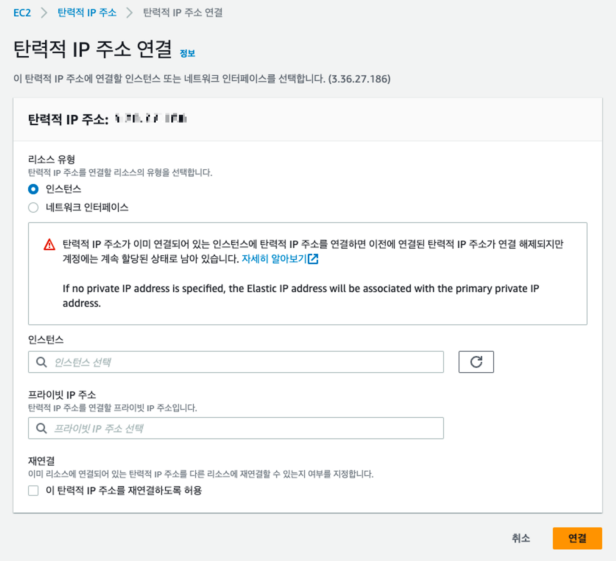 연결후에 탄력적 IP가 잘 연결됬는지 확인합니다.