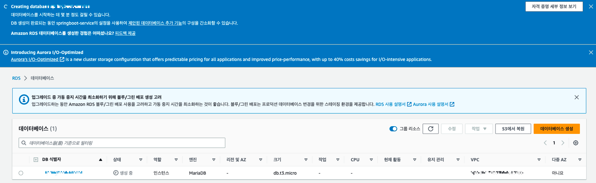 데이터베이스 생성 버튼을 누르면 생성되고 몇분이 소요된다.
