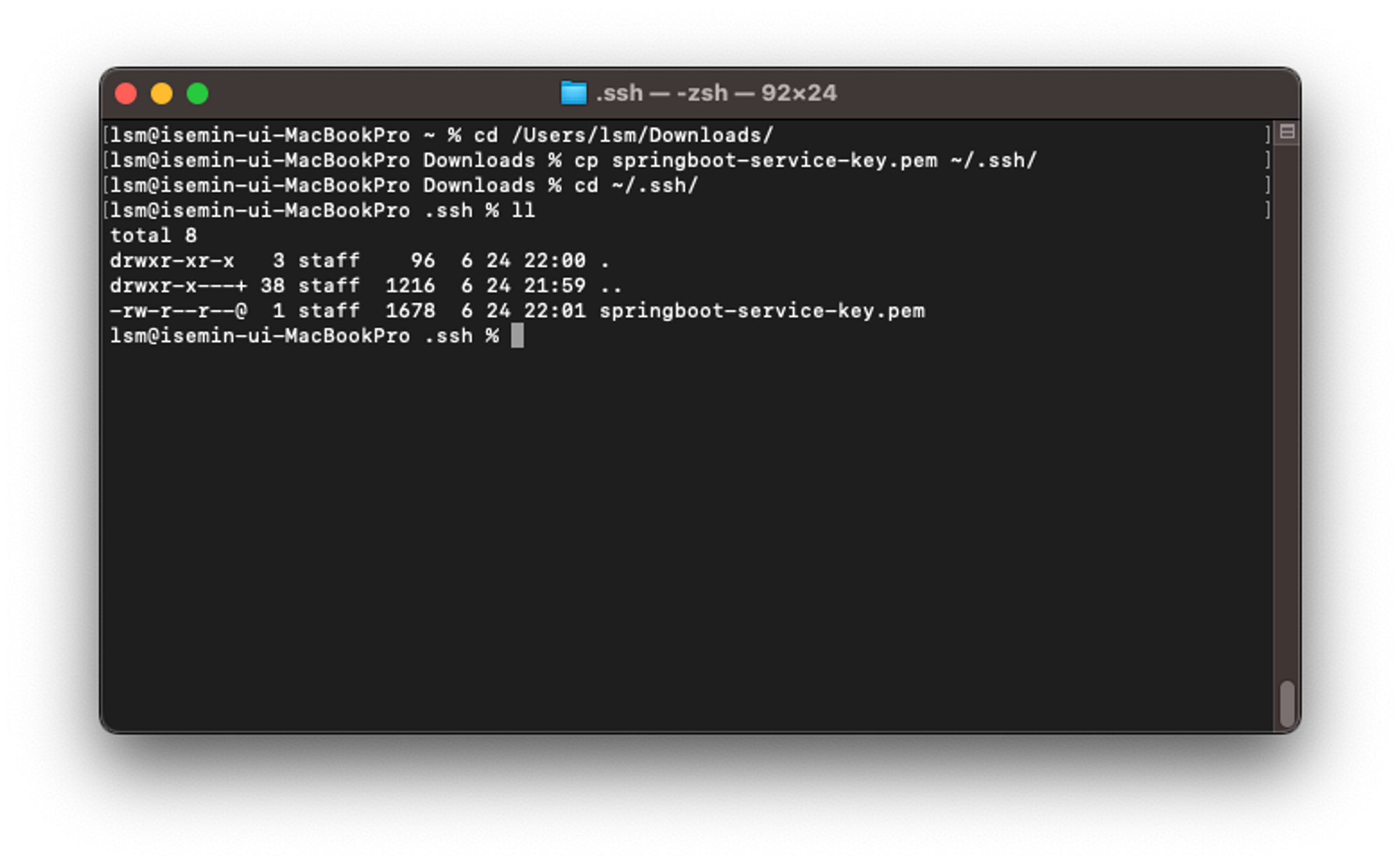 다운받았던 pem 파일을 ~/.ssh 로 복사해 놓으면 ssh 실행시 pem 키 파일을 자동으로 읽어 접속을 진행합니다.