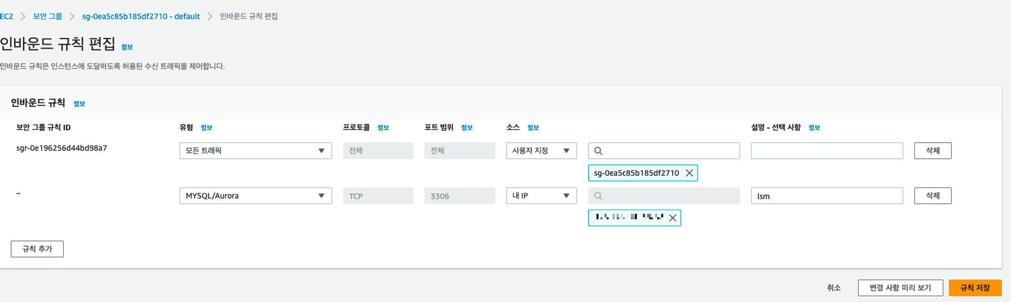 RDS에 접근하기 위해서는 RDS의 보안 그룹에 본인 PC의 IP를 추가하여야 한다.