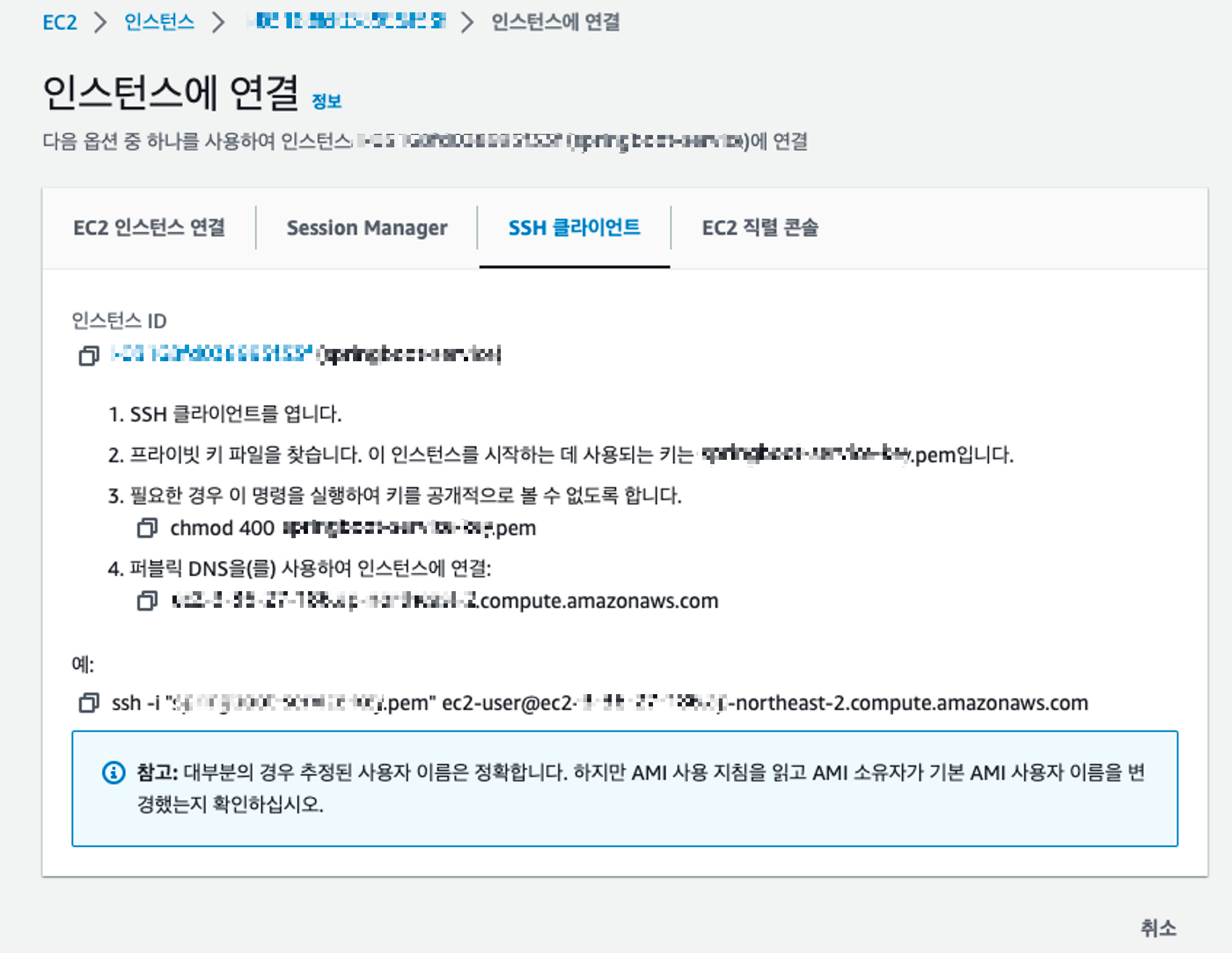 ssh -i pem 키 위치 EC2의 탄력적 IP 주소