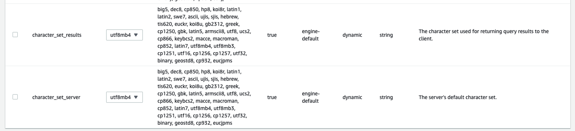 앞서 적용했던 파라미터중 character_set_database , collation_connection 2가지 항목은 MariaDB에서만 RDS파라미터 그룹으로는 변경이 되지 않기때문에 DB연결후 직접 쿼리를 실행해서 변경해줘야 한다.